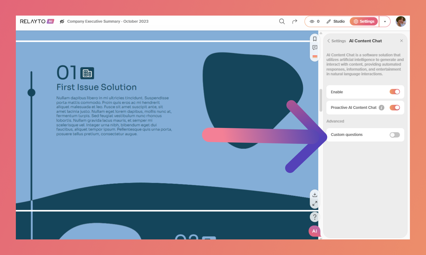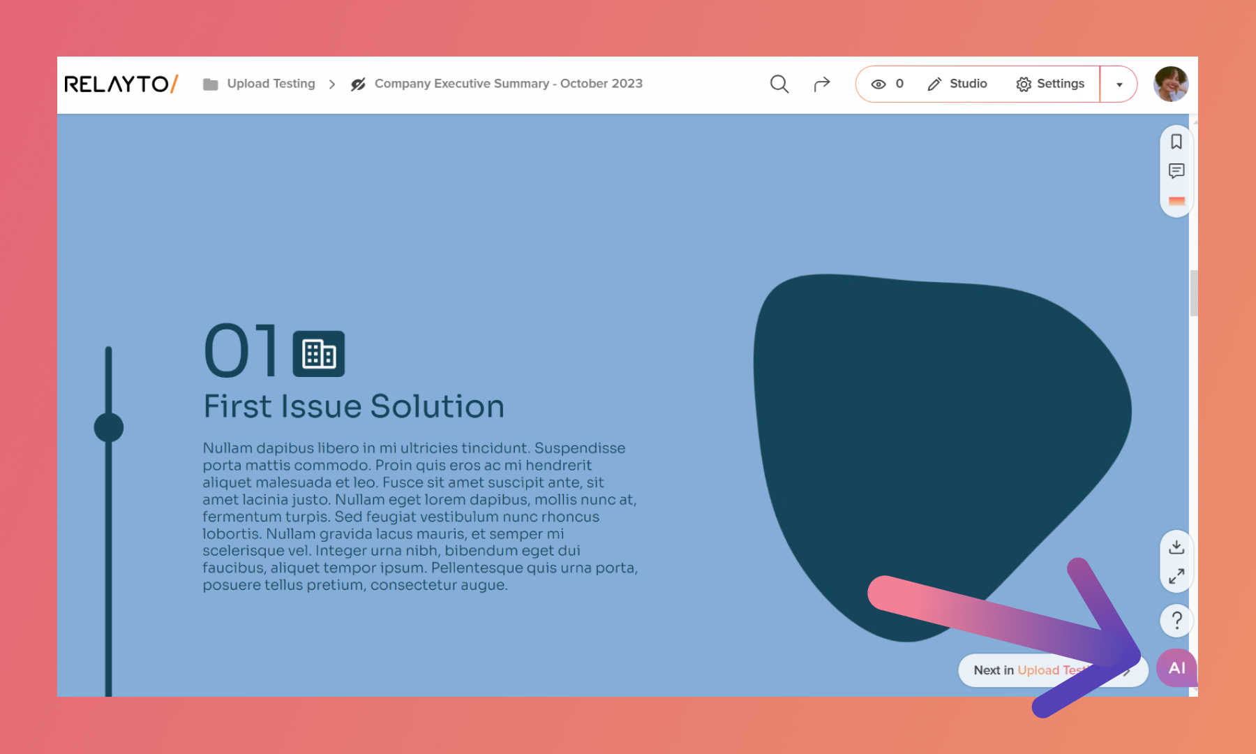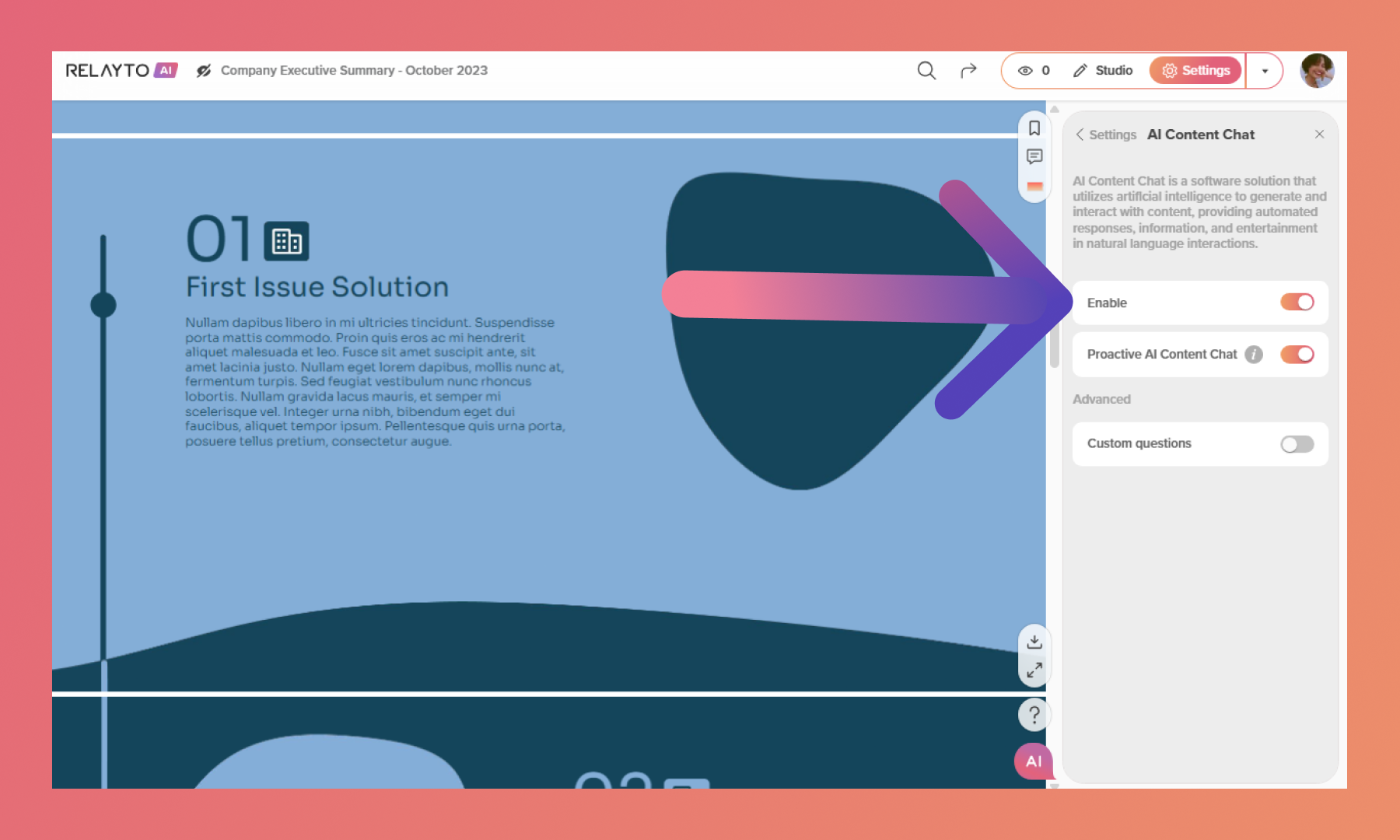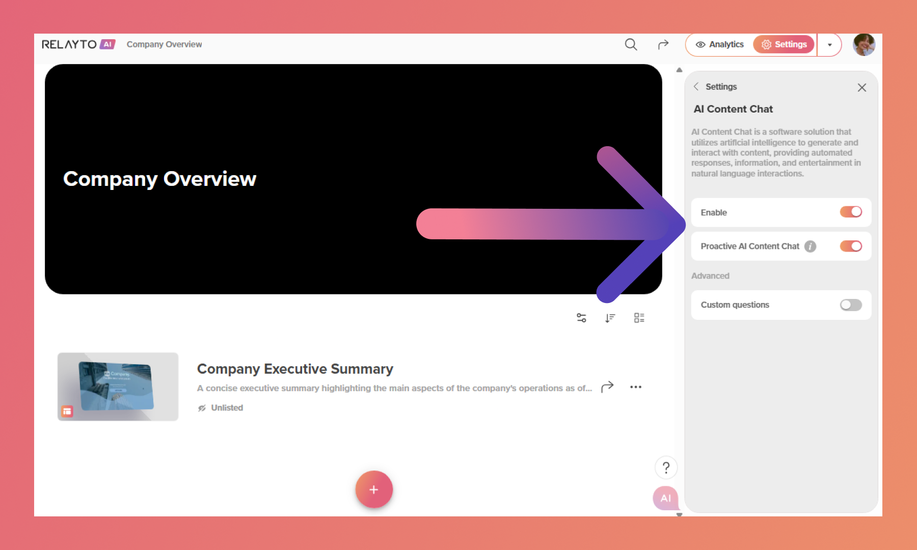 Open a digital experience or hub. The AI reads all content types in your workspace—PDFs, videos, images, audio, links, and more. To activate AI Chat, just open the content or hub you want it to reference.