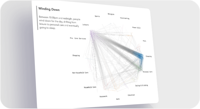 Winding Down Between 10:00pm and midnight, people wind down for the day, shifting from leisure to personal care and eventually going to sleep.