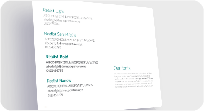 46 Realist Light Realist Semi-Light ABCDEFGHIJKLMNOPQRSTUVWXYZ abcdefghijklmnopqrstuvwxyz 0123456789 ABCDEFGHIJKLMNOPQRSTUVWXYZ abcdefghijklmnopqrstuvwxyz 0123456789 Realist Bold ABCDEFGHIJKLMNOPQRSTUVWXYZ abcdefghijklmnopqrstuvwxyz 0123456789 Realist Narrow ABCDEFGHIJKLMNOPQRSTUVWXYZ abcdefghijklmnopqrstuvwxyz 0123456789 Our fonts The American Alliance Museum identity is clean, refined, and lively. Typography is a vital part of that delicate balance. Realist is the typeface used to build the identity. Open Type Version (OTP) only. For smaller copy (such as body copy) Realist Narrow should be used. For web usage when Realist is not available, Arial should be used. Realist and Realist Narrow are available from MartinPlusFonts.com.