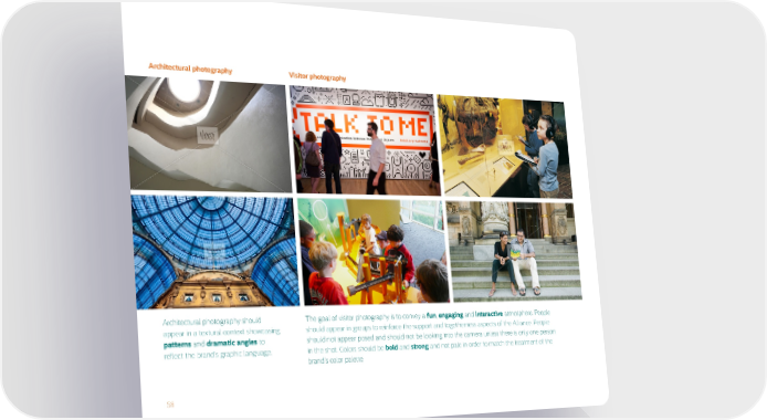 58 Architectural photography should appear in a textural context showcasing patterns and dramatic angles to reflect the brand's graphic language. The goal of visitor photography is to convey a fun , engaging and interactive atmosphere. People should appear in groups to reinforce the support and togetherness aspects of the Alliance. People should not appear posed and should not be looking into the camera unless there is only one person in the shot. Colors should be bold and strong and not pale in order to match the treatment of the brand's color palette. Architectural photography Visitor photography
