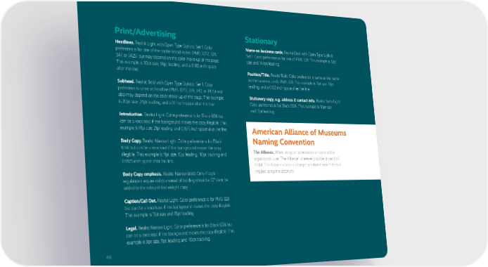 48 Print/Advertising Headlines. Realist Light with Open Type Stylistic Set 1. Color preference is for one of the cooler brand colors (PMS 3272, 328, 347, or 3425) but may depend on the color make-up of the page. This example is 30pt size, 34pt leading, and a 0.185 inch space after the line. Subhead. Realist Bold with Open Type Stylistic Set 1. Color preference is same as headline (PMS 3272, 328, 347, or 3425) and also may depend on the color make-up of the page. This example is 20pt size, 24pt leading, and a 0.1 inch space after the line. Introduction. Realist Light. Color preference is for Black 65% but can be a knockout if the background makes the copy illegible. This example is 14pt size, 21pt leading, and 0.1875 inch space after the line. Body Copy. Realist Narrow Light. Color preference is for Black 65% but can be a knockout if the background makes the copy illegible. This example is 11pt size, 15pt leading, -10pt tracking and 0.1875 inch space after the line. Body Copy emphasis. Realist Narrow Bold. Only if style regulations require italics instead of bolding should a 10° slant be added to the relevant text-weight copy. Caption/Call Out. Realist Light. Color preference is for PMS 328 but can be a knockout if the background makes the copy illegible. This example is 11pt size and 15pt leading. Legal. Realist Narrow Light. Color preference is for Black 65% but can be a knockout if the background makes the copy illegible. This example is 8pt size, 11pt leading and -10pt tracking. Stationary Name on business cards. Realist Bold with Open Type Stylistic Set 1. Color preference is for one of PMS 328. This example is 12pt size and 14.4pt leading. Position/Title. Realist Bold. Color preference is same as the name on the business cards: PMS 328. This example is 11pt size, 13pt leading, and a 0.02 inch space after the line. Stationery copy, e.g. address & contact info. Realist Semi-Light. Color preference is for Black 90%. This example is 10pt size and 13pt leading. American Alliance of Museums Naming Convention The Alliance. When using an abbreviation of name of the organization, use "The Alliance" wherever possible, instead of AAM. The Alliance carries a stronger emotional benefit than is implied using the acronym. 48