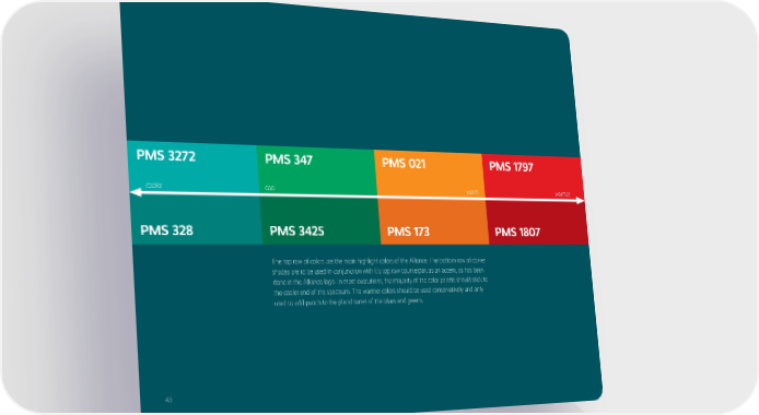 45 PMS 3272 PMS 347 PMS 021 PMS 1797 PMS 328 PMS 3425 PMS 173 PMS 1807 The top row of colors are the main highlight colors of the Alliance. The bottom row of darker shades are to be used in conjunction with it's top row counterpart as an accent, as has been done in the Alliance logo. In most executions, the majority of the color palette should stick to the cooler end of the spectrum. The warmer colors should be used conservatively and only used to add punch to the placid tones of the blues and greens. cooler warmer cool warm 45