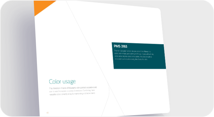 43 Color usage The American Alliance of Museums color palette is expansive and can be used to express a variety of emotions. Combining these versatile colors correctly is key to maintaining a cohesive brand. PMS 3165 This rich blue-green tone is the core color of the Alliance. It is stable and complex and soothing to the eye. It pairs well with any of the other brighter colors in the palette. Any greys should be converted to white before being placed atop this color.