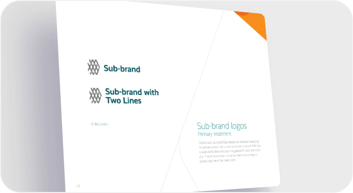 24 The full color, sub-brand logo (regular or knockout) should be the primary version that is used on relevant materials. Full black is available for faxes and gray is suggested for black and white jobs. The white knockout should be used when the logo is placed atop one of the brand colors. 01 Full color Sub-brand logos Primary treatment Sub-brand with Two Lines Sub-brand
