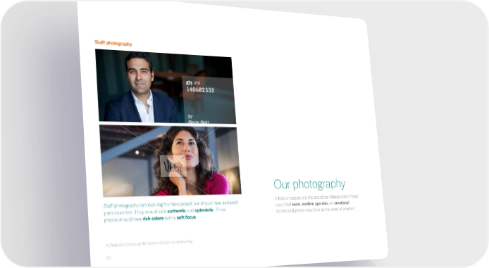 57 Our photography A focus on people is at the core of the Alliance brand. Photos should feel warm , modern , spacious and emotional . Architectural photos should not be the center of attention. All featured photos are for demonstration purposes only. Staff photography can look slightly more posed, but should have a relaxed portraiture feel. They should look authentic and optimistic . These photos should have rich colors with a soft focus . Staff photography