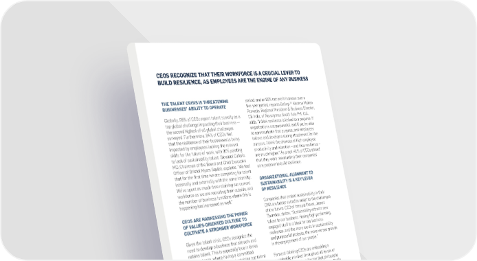 T H E 1 2 T H U CEOS RECOGNIZE THAT THEIR WORKFORCE IS A CRUCIAL LEVER TO N I T E BUILD RESILIENCE, AS EMPLOYEES ARE THE ENGINE OF ANY BUSINESS D N “If you want the best people to A T I work for you, you have to have O N diversity. And it needs to have top S G L O THE TALENT CRISIS IS THREATENING period, and an 85% net profit increase over a sustainability, it would have to be fully embedded management buy in. If you don’t B A 18 do that, you’re not going to be L C BUSINESSES’ ABILITY TO OPERATE five-year period, reports Gallup. Krishna Mohan within organizations. Leaders would be compensated O successful.” M Puvvada, Regional President & Business Director, based on sustainability outcomes, and each division P A C Globally, 96% of CEOs report talent scarcity as a CB India, of Novozymes South Asia Pvt. Ltd., would have specific goals. These are the actions T Solange Ribeiro, - A top global challenge impacting their business — C adds, “I think resilience is linked to a purpose. If we need.” Vice-president of Neoenergia and Vice-chair C E of the Board of the UN Global Compact N the second highest of all global challenges organizations are purposeful, and if you’re able T U R surveyed. Furthermore, 94% of CEOs feel to communicate that purpose, and employees A DIVERSE WORKFORCE IS A KEY MARKER E C E that the resilience of their businesses is being believe and develop a strong attachment for the OF AN INNOVATIVE COMPANY O S T impacted by employees lacking the relevant purpose, I think the chances of high employee U D skills for the future of work, with 91% pointing productivity and retention – and thus resilience – Companies that embrace diversity, equity, and Y to lack of sustainability talent. Giovanni Caforio, are much higher.” As proof, 41% of CEOs stated inclusion (DEI) are not only taking action on their “Sustainability also means how MD, Chairman of the Board and Chief Executive that they were reevaluating their companies’ sustainability values, but also building resilience. much humanity, compassion, and Officer of Bristol Myers Squibb, explains, “We feel core purpose to build resilience. Over half (56%) of CEOs are increasing their workforce empathy your business has for your that for the first time we are competing for talent diversity to build resilience. Cultivating a diverse employees. It’s important to include internally and externally with the same intensity. workforce with varied mindsets is more likely to all these criteria into sustainability We’ve spent as much time retaining our current ORGANIZATIONAL ALIGNMENT TO in order to bring out the potential SUSTAINABILITY IS A KEY LEVER create meaningful innovations and attract stronger and creativity of your employees.” workforce as we are recruiting from outside, and OF RESILIENCE talent to strengthen resilience. Sandra Wu, Wen-Hsiu, the number of business functions where this is Chairperson and CEO of Kokusai Kogyo Co., Ltd., NK Chaudhary, happening has increased as well.” Companies that embed sustainability in their explains, “As a corporation, we need innovation to Social Entrepreneur, Chairman & DNA are better suited to adapt to the challenges survive. And innovation comes from a diverse group Managing Director of Jaipur Rugs CEOS ARE HARNESSING THE POWER of the future. CEO of Intrepid Travel, James of minds. Creating something together, bringing in OF VALUES-ORIENTED CULTURE TO Thornton, states, “Sustainability attracts new different experiences and knowledge, values, and CULTIVATE A STRONGER WORKFORCE talent to our business. Having high performing, backgrounds, paired with an open minded and level engaged staff is critical for our business environment, is key.” Given the talent crisis, CEOs recognize the resilience, and the more we do in sustainability “Being sustainable is now part of need to develop a business that attracts and and purposeful projects, the more we see growth However, as part of an inclusive workforce, companies the Amadeus value proposition for retains talent. This is especially true in times in the engagement of our people.” must also take care of their people. To that end, 58% employees. We also see that being of turbulence, where having a committed of companies are offering physical and/or mental a responsible company is top of workforce and attracting and retaining top talent Forward-thinking CEOs are embedding a wellness resources for their workforce. Chuck Robbins, mind for new hires these days.” are both linked directly to business resilience sustainable mindset throughout all levels of Chair and CEO of Cisco, emphasizes: “Culture Luis Maroto, and profitability. Per Gallup’s annual report on their company and reinforcing that philosophy matters a lot more than people think. We do several President and CEO of Amadeus IT Group S.A. employee engagement, companies with a highly through tangible objectives and goals. As Belén tactical things to contribute to our culture, such as engaged workforce have 21% higher profitability Garijo, Chair of the Executive Board and CEO of maintaining transparency, granting great flexibility on 17 on average. Merck KGaA, shares, “The workforce is crucial work location, and embracing mental health.” While it for mobilizing on sustainability plans. Each and is heartening to see the private sector taking mental Creating a strong culture aligned with company every business leader in an organization has to health more seriously, there is vast inequality in “Our view on sustainability values that resonate with employees is a be contributing to the sustainability priorities treatment options globally. As reported by the encompasses promoting female key differentiator for companies. It helps and goals.” World Health Organization, 70% of individuals with leaders within our organization as attract and retain talent, build resilience, and mental health disorders receive treatment in well as promoting gender equality em