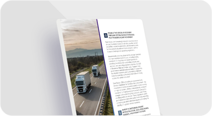 T H E 1 2 T H U ENABLE THE CIRCULAR ECONOMY However, governments alone are not solely PROVIDE EDUCATION AND FINANCING N I T THROUGH ESTABLISHING STANDARDS responsible – businesses must be ready to do FOR SMALL AND MEDIUM-SIZED E D N FOR TRANSBOUNDARY MOVEMENT their part as well. President and CEO of S&P ENTERPRISES (SMES) A T I O Global, Douglas L. Peterson, expresses, “We need N Businesses are increasingly trying to move to a more Business leaders are looking to governments S G to see a much bigger emphasis on rebuilding, L O circular business models to not only counter current to support the private sector as a whole, not B upgrading, and modernizing infrastructure, but to A geopolitics, economic uncertainty, and increasing costs, only by engaging with the largest companies, L C finance this, we’re going to need public-private O but also proactively address future concerns, such as M but by supporting SMEs. CEOs of SMEs P partnerships – a combination of public sector A C resource shortages or upcoming regulations. feel that support has been limited: 82% of T financing and private investment. - A 32 C SMEs feel that they need increased access C E N Governments are a key player in the circular transition to financial resources to build resilience T INCORPORATE WORKER AND U 33 R and have multiple levers to pull, including raising COMMUNITY IMPACTS INTO POLICY (relative to 72% of the largest companies), E C E standards for recycling and repairing products, DECISIONS and 85% feel they need educational resources O S T providing incentives for sustainable products and on business resilience (relative to 78% of U D services, and removing regulatory barriers. As CEO 34 Y To support business actions in the just transition, the largest companies). As Krishna Mohan of Braskem, Roberto Simões, says, “Support from CEOs are calling on governments to step up Puvvada, Regional President & Business governments and international bodies in supporting and facilitate a just transition for the global Director, CB India of Novozymes South Asia the circular economy and sustainability initiatives workforce. As Lucara Diamond Corp’s President Pvt. Ltd., explains, “The SMEs do not have the is key to speeding up the implementation of strong and Chief Executive Officer, Eira Thomas, says, resources, and it becomes a responsibility actions for carbon reduction.” “Companies need to design sustainability of industry bodies, governments, and trade programs in collaboration with governments and associations to recognize that we need to Specifically, CEOs are calling on governments to local communities to ensure they are working learn and develop a language where [SMEs] develop standards for transboundary movement – the together to address their priorities and needs.” can connect with us. Today, the language movement of products/waste products across country of sustainability is still quite complex and or regional borders. Without internationally accepted A truly just transition can only be achieved with not everybody can understand it. If you’re standards for transboundary movement, companies collaboration. Government, businesses, and able to translate sustainability into impact, struggle with reclaiming their products, even if they workers must cooperate to ensure that, as the sustainability action into financial terms, are designed to be circular. These regulations, while economy transitions to embrace renewables and articulate measurement criteria, put in place to protect the public from toxic materials, and sustainability, the people currently sustainability starts to resonate a lot better.” are having an unintended consequence of limiting the powering our economy are not left behind. viability of a global, circular economy. CEOs highlight the criticality of the just Green Touches’ CEO, Adrienne Doolan, transition being community and worker-led. concurs, “SMEs are the backbone of the INVEST IN SUSTAINABLE BASIC Dr. Bisi Bright, CEO of LiveWell Initiative LWI, economy,” but currently they are at risk INFRASTRUCTURE, INCLUDING ROADS, notes, “The problem with governments is that of being left out of the picture. Without BRIDGES, AND ENERGY SYSTEMS people at the top often do not see the bottom SMEs, the SDGs will remain out of reach; clearly. To include the people’s voice, there governments therefore need to prioritize One of the most impactful levers that governments needs to be more collaboration between the assisting small and medium-sized business can pull is investing in sustainable infrastructure. With leaders of communities and government, owners to incorporate sustainable practices this investment in sustainable, equitable infrastructure, for example, through town hall meetings.” into their operations. there is not only an opportunity to make a positive environmental and social impact, but also the possibility of creating new markets for sustainable products, services, and processes. As Paul Abbott, CEO of American Express Global Business Travel (Amex GBT), says, “At the moment, sustainable technologies and innovations, such as sustainable aviation fuels, are the only way we can make significant progress. And that won’t happen unless there is massive For more information on the role of business in ensuring a just transition, please refer to infrastructure investment, primarily from governments, the United Nations Global Compact’s Introduction to a Just Transition Business Brief. to drive long-term structural change.” 32. Defined as companies with less than USD 25 million in annual revenue. 33. Defined as companies with greater 86 than USD 1 billion in annual revenue. 34. Defined as companies with greater than USD 1 billion in annual revenue. 87