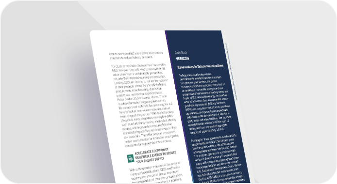 T H E 1 2 T H U Case StudyAPPLY ANALYTICS-DRIVEN SCENARIO keen to see more R&D into creating lower-carbon Case Study N I T PLANNING INTO BUSINESS PROCESSESmaterials to reduce industry emissions.” E BRISTOL MYERS SQUIBB VERIZON D N A T I Geopolitics, trade regulations, climate change O For CEOs to maximize the benefits of sustainable N and weather events are increasing the range S G R&D with a Focus on Equity R&D, however, they will need to assess their full Renewables in Telecommunications L O and ambiguity of possible scenarios, driving B value chain from a sustainability perspective, A CEOs to adopt analytics-driven scenario L C Bristol Myers Squibb (BMS), an American not only their material sourcing and production. To help meet its climate-related O M planning to prepare for the future. Currently, P multinational pharmaceutical company, Leading CEOs are looking to reduce the footprint commitments and facilitate the transition A C 62% of CEOs are strengthening their scenario T - is committed to addressing inequity in of their products across the lifecycle including to a greener grid, Verizon, the global A planning and analysis capabilities, with a split C C healthcare, through providing equitable procurement, manufacturing, distribution, telecommunications company, embarked on E N of 57% for CEOs of SMEs and 69% of CEOs T access to medicines. For example, in product use, and reverse logistics phases. an ambitious renewable energy purchase U R 2020, BMS pledged to locate at least from larger companies. As Alejandro Carrillo, Malek Sukkar, CEO of Averda, shares, “There program and has become a leading corporate E C E 25% of US sites participating in new BMS CEO of Masisa, says, “In the new norm, we need is a transformation happening in materials. buyer of U.S. renewable energy. Verizon has O S T to perform more proactive risk analysis and U clinical trials in racially and ethnically We cannot treat materials the same way. We will entered into more than 20 renewable energy D diverse metro areas. By the end of 2021, learn quickly from our mistakes to empower our purchase agreements (REPAs). Verizon’s Y people to make decisions faster.”have to look at how we can reuse materials at the company exceeded its goal, locating every stage of the journey.” With the full product REPAs are long-term virtual power purchase 54% of US clinical trial sites in highly This serves the dual purpose of both helping lifecycle in mind, companies may explore paths agreements and generally are expected to diverse communities. Ensuring diversity of CEOs prepare for potential scenarios, but also such as refurbishing, reusing, and product sharing help finance the development of new third- clinical trials enables underrepresented test the potential benefits and repercussions of models, which can reduce resource intensive party solar and wind facilities. The facilities communities to participate in the different courses of action. For more advanced manufacturing activities and dependence on virgin associated with Verizon’s REPAs span 12 development of critical and potentially analysis, 17% of CEOs are implementing artificial raw materials. This wider scope of assessment states and have a projected aggregate life-saving medicines, increasing healthcare intelligence for real-time risk analysis, with further opens the door for innovation, as companies capacity of approximately 2.8 GW. accessibility and equity by helping address the financial services and high-tech industries can iterate throughout the entire process. 1 blind spots in the health system. Funding for these agreements is substantially leading the trend (28% each). supported by Verizon’s USD 4 billion green ACCELERATE ADOPTION OF Furthermore, the Bristol Myers Squibb President of CTC Group [The Central Trading RENEWABLE ENERGY TO SECURE bond program, which is one of the largest Foundation, an independent charitable Company], Ahmed Abdellatif, shares, “We need YOUR ENERGY SUPPLY among corporate issuers in the USD market. organization, started a trailblazing program stronger planning tools and analysis. We need The program operates in accordance with committed to training at least 250 clinical models that show, over a longer timeline, what is With cutting carbon emissions at the center of Verizon’s Green Financing Framework that trial investigators who are diverse and/the impact you can have and how you are driving many sustainability plans, CEOs need to also aligns with internationally recognized green or committed to increasing diversity in towards it. That will help drive sustainability secure green sources of energy and ensure financing principles and advances relevant clinical trials in partnership with the implementation and building resilience.”the sustainability of their energy supply chain. U.N. Sustainable Development Goals. Verizon Virginia Commonwealth University and the Renewable energy generation is a promising has fully allocated the net proceeds from American Association for Cancer Research solution, both offering affordable energy the first USD 3 billion of issuances primarily (AACR) – a $100+ million dollar investment EMBED SUSTAINABILITY CRITERIA and removing dependence on fossil fuels – a to finance REPAs for new renewable energy 2INTO RESEARCH & DEVELOPMENT over five years. volatile commodity in regard to pricing. As projects and provided related impact reporting. Research & development (R&D) is a clear driver Arturo Gonzalo Aizpiri, Chief Executive Officer 1. https://www.bms.com/life-and-science/news-and-perspectives/of growth and innovation in any company. It of Enagás, comments, “Security of supply and Verizon’s REPAs position it to achieve its fulfilling-out-role-in-increasing-clinical-trial-diversity.html 2. https://news.bms.com/news/philanthropy/2022/The-Robert-is therefore imperative that sustainability is decarbonization are two sides of the same coin.”goal to source or generate renewable A.-Winn-Div