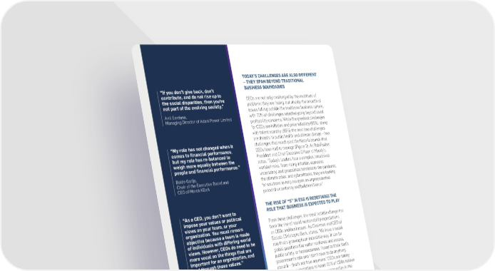 T H E 1 2 T TODAY’S CHALLENGES ARE ALSO DIFFERENT H U and Chief Executive Officer of Export Development N I T – THEY SPAN BEYOND TRADITIONAL E Canada, shares, “CEOs have become a more trusted D N BUSINESS BOUNDARIES source of information and policy than governments or A “If you don’t give back, don’t T I O contribute, and do not rise up to other traditional institutions.” N CEOs are not only challenged by the multitude of S G the social disparities, then you’re L O problems they are facing, but also by the breadth of B not part of the evolving society.” Failure to address inequality, corruption, climate A issues falling outside the traditional business sphere, L C O Anil Sardana, change, and degrading infrastructure has undermined M with 70% of challenges selected going beyond usual P Managing Director of Adani Power Limited A confidence in public institutions, with CEOs emerging C profitability concerns. While the greatest challenges T - as a trusted voice. CEO of Alpargatas S.A., Roberto A C for CEOs are inflation and price volatility (98%), along C E Funari, shares, “There is a declining trust in N with talent scarcity (96%), the next two challenges T U institutions, and people now look to the private sector, R are threats to public health and climate change – two E C activists, and NGOs to fill that gap.” E “My role has not changed when it challenges that reach past the historic bounds that O S T comes to financial performance, CEOs have had to manage (Figure 2). As Rob Fauber, U D but my role has re-balanced to President and Chief Executive Officer of Moody’s, CEOs are increasingly expected to step into that new Y weigh more equally between the notes, “Today’s leaders face a complex, interlinked role, straddling the line between public and private people and financial performance.” world of risks. From rising inflation, economic responsibilities. As Managing Director of South East Belén Garijo, uncertainty, and geopolitical tensions to the pandemic, Water (Australia), Lara Olsen, shares, “A CEO’s role Chair of the Executive Board and the climate crisis, and cyberattacks, they are looking is no longer just about fulfilling your organizational CEO of Merck KGaA for solutions to help navigate an unprecedented goals and activities, but increasingly about your period of uncertainty and build resilience.” engagement with your broader community locally, nationally, THE RISE OF “S” IN ESG IS REDEFINING THE and globally to make a positive contribution.” “As a CEO, you don’t want to ROLE THAT BUSINESS IS EXPECTED TO PLAY impose your values or political THE CEO ROLE IS SHIFTING BASED ON views on your team, or your From these challenges, the most notable change has CHANGING EXPECTATIONS organization. You must remain been the rise of social sustainability expectations objective because a team is made on CEOs and businesses. As Chairman and CEO of These rising expectations for CEOs are changing the way of individuals with differing world Ecolab, Christophe Beck, states, “We have a social they interact with the public. For example, 70% of CEOs views. However, CEOs do need to be role that’s growing in an incredible way. It can be feel it is their role to speak out publicly on potentially more vocal on the things that are important for an organization, and global questions like water resilience and access, divisive social issues. Per Arcadis NV’s Chief Executive lead through those values.” public safety, or homelessness. I used to think that’s Officer, Peter Oosterveer, “There is an expectation for government’s role and I don’t have to do anything CEOs to speak out on a lot of things - understandably so, Gimena Peña Malcampo, about it – that’s not true anymore.” CEOs are taking because we have a larger role to play now. Nevertheless, CEO of Pier2 Marketing this shift in expectations to heart: 91% of CEOs believe there are a lot of grey areas, so we have to be selective that their role is to protect local communities in the on which societal issue to speak out on.” regions they operate. D Narain, President of Bayer South Asia & Global Head of Smallholder Farming, CEOs in the developing world feel this pressure most “We’re in a crisis of leadership now. notes, “Companies increasingly recognize they have strongly, with 77% of CEOs feeling that they should The problems that we’re working a critical role to play in not only addressing complex speak out publicly on potentially divisive issues, in to solve are solvable, so our role - problems like climate change, but also in improving the whether it be business leaders or world—environmentally, socially, and economically.” comparison to the 63% of CEOs in the developed political leaders - is to lead with world. CEOs of African companies feel most strongly passion and come together to This rise in CEO expectations is coupled with a that they need to speak out (78% agree) while those implement solutions.” in Europe (65% agree) and North America (54% agree) loss of confidence in governments and multilateral are less convinced. Assia Riccio, Founder of Evolvin’ George Oliver, institutions. According to the Edelman Trust Chairman and CEO of Johnson Controls Barometer, business has emerged as the most Women and Nia Trading, states, “CEOs working in the trusted institution (61%), followed by NGOs (59%) social impact space, should engage in international 5 speaking opportunities to respond to the issues of the and governments (52%). Mairead Lavery, President moment.” As CEOs’ daily responsibilities compound with increasing pressure from the public, CEOs are being held to a new standard of leadership. 20 5. Edelman (2022) 2022 Edelman Trust Barometer: The Cycle of Distrust. 21
