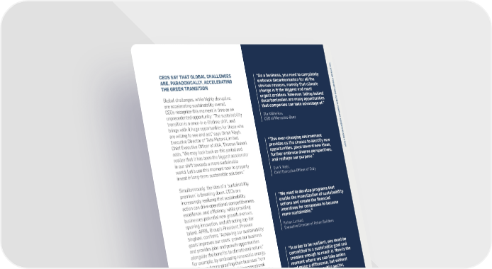 T H E 1 2 T CEOS SAY THAT GLOBAL CHALLENGES “As a business, you need to completely H U N I embrace decarbonization for all the T ARE, PARADOXICALLY, ACCELERATING E obvious reasons, namely that climate D N THE GREEN TRANSITION A T change is it the biggest and most I O N Global challenges, while highly disruptive, urgent problem. However, hiding behind S G L decarbonization are many opportunities O are accelerating sustainability overall. B A CEOs recognize this moment in time as an that companies can take advantage of.” L C O M unprecedented opportunity: “The sustainability Ola Källenius, P A CEO of Mercedes-Benz C transition is a once-in-a-lifetime shift, and T - A brings with it huge opportunities for those who C C E N are willing to see and act,” says Girish Wagh, T U R Executive Director of Tata Motors Limited. “This ever-changing environment E C E Chief Executive Officer of AXA, Thomas Buberl, provides us the chance to identify new O S T adds, “We may look back on this period and U opportunities, pivot toward new ideas, D realize that it has been the biggest accelerator further embrace diverse perspectives, Y in our shift towards a more sustainable and reshape our purpose.” world. Let’s use this moment now to properly invest in long-term sustainable solutions.” Sue Y. Nabi, Chief Executive Officer of Coty Simultaneously, the idea of a ‘sustainability premium’ is breaking down. CEOs are increasingly realizing that sustainability “We need to develop programs that action can drive operational competitiveness, enable the monetization of sustainability excellence, and efficiency, while providing actions and create the financial businesses potential new growth avenues, incentives for companies to become spurring innovation, and attracting top-tier more sustainable.” talent. APRIL Group’s President, Praveen Rohan Lunkad, Singhavi, confirms, “Achieving our sustainability Executive Director of Rohan Builders goals improves our costs, grows our business and provides jobs and growth opportunities alongside the benefits to climate and nature.” For example, by embracing renewable energy, “In order to be resilient, one must be CEOs are future-proofing their business from committed to a sustainable goal and energy fluctuations and building operational creative enough to reach it. Now is the efficiency and reliability. Sustainability also helps moment where we can take action companies maintain their license to operate, and make a difference, but without as sustainability is also seen as a measure of the support of the public sector, responsible corporate action by communities, it’s impossible.” customers, and governments. Clara Arpa, CEO of ARPA CEOs are therefore accelerating their progress towards sustainability goals because of, not despite, global challenges such as geopolitics “UPM’s valuation is no longer based just and climate change. ZenSar Technologies’ on earnings or growth anymore. The other Interim Managing Director, Anant Goenka, big part of the valuation is based on confirms, “These global challenges are sustainability, leadership, culture, amplifying and accelerating the march towards and the values that you represent.” the ESG goals that we set for ourselves.” Jussi Pesonen, President and CEO of UPM-Kymmene Corporation 38 39