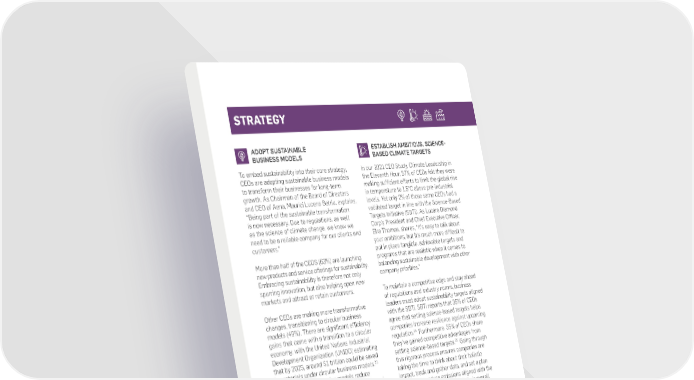 T H E 1 2 T H U N I T E STRATEGY D N A T I O N S G L O B ADOPT SUSTAINABLE ESTABLISH AMBITIOUS, SCIENCE- ADOPT A NATURE-POSITIVE President, CEO, and Representative Director of A L C BUSINESS MODELS BASED CLIMATE TARGETS BUSINESS STRATEGY Asahi Group Holdings, Ltd., states, “As a group O M P of companies that operates businesses using A To embed sustainability into their core strategy, In our 2021 CEO Study, Climate Leadership in C While biodiversity has been overlooked on T the blessings of nature, including water and - A CEOs are adopting sustainable business models the Eleventh Hour, 57% of CEOs felt they were the CEO agenda, leading CEOs are taking C agricultural products, we at Asahi show C E to transform their businesses for long-term making sufficient efforts to limit the global rise sustainable business models to the next level N T sensitivity to biodiversity. Now that the TNFD U growth. As Chairman of the Board of Directors in temperature to 1.5°C above pre-industrial R by championing nature-positive strategies. framework has been put in place, we are working E C and CEO of Aena, Maurici Lucena Betriu, explains, levels. Yet only 2% of those same CEOs had a E Leading examples holistically account for a to assess our impact on biodiversity to accelerate O S “Being part of the sustainable transformation validated target in line with the Science-Based business’ potential impacts on biodiversity. T our efforts. However, biodiversity protection is U D is now necessary. Due to regulations, as well Targets Initiative (SBTi). As Lucara Diamond Most CEOs (80%) currently feel that they have something individual companies cannot do alone Y as the science of climate change, we know we Corp’s President and Chief Executive Officer, a strong understanding of how their business – we must work together as a whole industry and need to be a reliable company for our clients and Eira Thomas, shares, “It’s easy to talk about impacts biodiversity, and 72% of CEOs say that as whole society.” customers.” your ambitions, but it’s much more difficult to they understand how to leverage nature-based put in place tangible, achievable targets and solutions within their company. However, only More than half of the CEOS (63%) are launching programs that are realistic when it comes to 35% of CEOs are initiating nature protection and/ INCLUDE ESG IMPACTS IN new products and service offerings for sustainability. balancing sustainable development with other or restoration projects, indicating that this is a INVESTMENT DECISIONS Embracing sustainability is therefore not only company priorities.” high-growth space. Adopting a systems-thinking spurring innovation, but also helping open new approach that looks at relationships rather To ensure that investment decisions are markets and attract or retain customers. To maintain a competitive edge and stay ahead than components across an ecosystem helps made with long-term value in mind, CEOs of regulations and industry norms, business companies understand their holistic impact and are reassessing how they evaluate capital Other CEOs are making more transformative leaders must adopt sustainability targets aligned encourages long-term strategic planning. allocations. In particular, leading CEOs are changes, transitioning to circular business with the SBTi. SBTi reports that 35% of CEOs Embracing a nature-positive business strategy going beyond economic returns, and embedding models (49%). There are significant efficiency agree that setting science-based targets helps helps companies proactively address risks, ESG criteria in their investment decisions gains that come with a transition to a circular companies increase resilience against upcoming evaluate their overall impact, and often to deliver broader societal value from their 24 economy, with the United Nations Industrial regulation. Furthermore, 55% of CEOs share encourages collaboration with other industry capital. As Atsushi Katsuki, President, CEO, and Development Organization (UNIDO) estimating they’ve gained competitive advantages from and government partners. As Keiichi Iwata, Representative Director of Asahi Group Holdings, 25 that by 2025, around $1 trillion could be saved setting science-based targets. Going through Representative Director & President of Ltd., states, “One way of building resilience is 23 in materials under circular business models. this rigorous process ensures companies are Sumitomo Chemical Company, Ltd., says, evaluating investments in a new way – not just Not only do these circular models reduce taking the time to think about their holistic “Nature positive is a concept or approach that the profit or cost reduction potential, but the waste flows, but they also increase businesses’ impact, track and gather data, and set a plan encompasses carbon neutrality. Mitigating and value it provides for society and sustainability.” resilience to supply chain shocks through reducing in motion to reduce emissions aligned with the reversing the loss of the components of nature, Some CEOs are embedding this ESG mindset in their dependence on limited raw materials. 1.5°C target, helping them craft their overall such as air, water and soil, is a pressing issue internal projects – from developing sustainable sustainability strategy. faced by humanity, and we should meet this products, to modernizing factories, to acquiring New, sustainable business models will challenge head-on, placing utmost and equal talent. In addition, some CEOs considering also facilitate structural transformation, importance on each of those components.” mergers & acquisitions (M&A) are integrating creating jobs in resource recovery, repair, and ESG criteria into their due diligence process – a remanufacturing. However, it is equally important Recently, the Taskforce on Nature-related lever companies can use to acquire the skills, to ensure workers share in the benefits of these Financial Discl