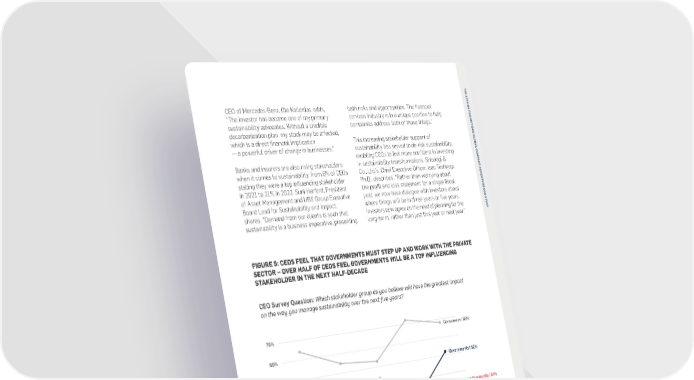 T H E 1 2 T “Institutional investors and other STAKEHOLDERS ARE HELPING DRIVE H U CEO of Mercedes-Benz, Ola Källenius, adds, both risks and opportunities. The financial N I stakeholders are now asking T SUSTAINABILITY TO THE TOP OF CEO “The investor has become one of my primary services industry is in a unique position to help E for reporting across the entire D N AGENDAS sustainability advocates. Without a credible companies address both of those things.” A T value chain. This wider reporting I O decarbonization plan, my stock may be affected, N footprint is changing how we As CEOs create their sustainability agenda, the S G which is a direct financial implication This increasing stakeholder support of L operate and view our business.” O stakeholders who influence their sustainability B — a powerful driver of change in businesses.” sustainability has served to de-risk sustainability, A Robert Bellisle, plans have shifted. Today, CEOs are increasingly L C enabling CEOs to feel more confident in investing O M President & Chief Executive Officer of QSL catering to customers and investors, demonstrating P Banks and insurers are also rising stakeholders in sustainability transformations. Shionogi & A Canada Inc. C how sustainability has evolved from a regulatory T when it comes to sustainability, from 6% of CEOs Co., Ltd.’s, Chief Executive Officer, Isao Teshirogi, - A C compliance issue to an opportunity to better engage C stating they were a top influencing stakeholder Ph.D., describes, “Rather than worrying about E N with key stakeholders. T in 2021 to 21% in 2022. Suni Harford, President the profit and loss statement for a single fiscal U R of Asset Management and UBS Group Executive year, we now have dialogue with investors about E C E “For the last three years, 60-70% of Customers remain at the top, with 68% of CEOs Board Lead for Sustainability and Impact, where things will be in three years or five years. O S my conversation with shareholders T stating that customers are the most impactful U shares, “Demand from our clients is such that Investors now agree on the need of planning for the D pertain to ESG.” stakeholder influencing their company’s sustainability sustainability is a business imperative, presenting long-term, rather than just this year or next year.” Y Peter Oosterveer, agenda. Marco Tronchetti Provera, Executive Arcadis NV’s Chief Executive OfficerVice Chairman and CEO of Pirelli & C. S.p.A., notes, “Competition used to be based on cost of performance. Now one of the key attributes FIGURE 5: CEOS FEEL THAT GOVERNMENTS MUST STEP UP AND WORK WITH THE PRIVATE customers are looking for is sustainability.”SECTOR – OVER HALF OF CEOS FEEL GOVERNMENTS WILL BE A TOP INFLUENCING “Distributed decision making is STAKEHOLDER IN THE NEXT HALF-DECADE a part of resilience that I think a Of all stakeholders, governments had the largest lot of people miss. You need to increase in their influence on the CEO sustainability talk to people, have town halls, agenda, nearly doubling since 2021 (31% in 2021 vs. CEO Survey Question: Which stakeholder group do you believe will have the greatest impact and make sure everyone is 52% in 2022). As governments increasingly adopt on the way you manage sustainability over the next five years? aligned on the message.” green policies, including incentives for renewables, Juan Luciano, infrastructure projects, and sustainability reporting Chairman & CEO of ADMguidelines, CEOs are feeling the pressure to transition % their businesses and work with government leaders Consumers | 68% to do so. Viviane Martins, CEO of Falconi, explains, “I believe governments can really stimulate resilience, 6% “Investment is necessary. And especially through innovation, if they work with Governments | 52% large investors – especially from business leaders.” 5% developed countries – care about ESG. Businesses in the developing Investors remain significantly influential as they 4% world, therefore, need to quickly increasingly engage in discussions on long-term adapt; otherwise we will not grow.” Investment Community | 34% growth and sustainability when making investment 3% Employees | 33% Natalia Cortez, decisions. In our 2021 study, CEOs felt that President of Calificadora de Riesgos investors had more influence on how they manage Boards | 22% Summaratings S.A.sustainability than ever before, nearly doubling 2% Banks and Insurers | 21% in just a five-year period (31% in 2021 vs. 18% in 2016). This trend has continued today, with 34% of 1% CEOs indicating that investors are a top influencing “We are going to see more tribalism stakeholder. Giovanni Caforio, MD, Chairman of the % in the future. We should learn from Board and Chief Executive Officer of Bristol Myers 20132016201920212022 countries that have experienced Squibb, says, “There are more discussions today when that and were able to get different I speak to our shareholders about climate than there groups of people to be able to work have ever been before. And there are more vocal **Stakeholders that came in at less than 20% were excluded from the figure above. These stakeholder categories include: together for a common good.” Communities (20% in 2022), Suppliers (16% in 2022), Competitors (11% in 2022), the United Nations (10% in 2022), expectations from our employees as well.” NGOs and Media (7% in 2022), Family (4% in 2022), and Organized labor (2% in 2022). James Boomgard, President and CEO of DAI Global, LLC 36 37