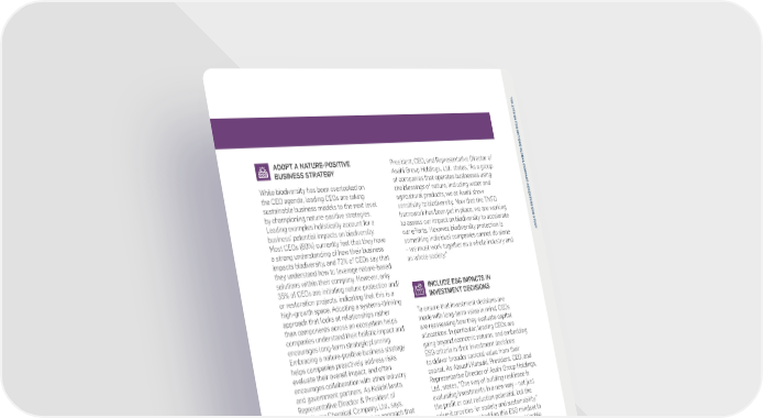 T H E 1 2 T H U N I T E STRATEGY D N A T I O N S G L O B ADOPT SUSTAINABLE ESTABLISH AMBITIOUS, SCIENCE-ADOPT A NATURE-POSITIVE President, CEO, and Representative Director of A L C BUSINESS MODELSBASED CLIMATE TARGETSBUSINESS STRATEGY Asahi Group Holdings, Ltd., states, “As a group O M P of companies that operates businesses using A To embed sustainability into their core strategy, In our 2021 CEO Study, Climate Leadership in C While biodiversity has been overlooked on T the blessings of nature, including water and - A CEOs are adopting sustainable business models the Eleventh Hour, 57% of CEOs felt they were the CEO agenda, leading CEOs are taking C agricultural products, we at Asahi show C E to transform their businesses for long-term making sufficient efforts to limit the global rise sustainable business models to the next level N T sensitivity to biodiversity. Now that the TNFD U growth. As Chairman of the Board of Directors in temperature to 1.5°C above pre-industrial R by championing nature-positive strategies. framework has been put in place, we are working E C and CEO of Aena, Maurici Lucena Betriu, explains, levels. Yet only 2% of those same CEOs had a E Leading examples holistically account for a to assess our impact on biodiversity to accelerate O S “Being part of the sustainable transformation validated target in line with the Science-Based business’ potential impacts on biodiversity. T our efforts. However, biodiversity protection is U D is now necessary. Due to regulations, as well Targets Initiative (SBTi). As Lucara Diamond Most CEOs (80%) currently feel that they have something individual companies cannot do alone Y as the science of climate change, we know we Corp’s President and Chief Executive Officer, a strong understanding of how their business – we must work together as a whole industry and need to be a reliable company for our clients and Eira Thomas, shares, “It’s easy to talk about impacts biodiversity, and 72% of CEOs say that as whole society.” customers.”your ambitions, but it’s much more difficult to they understand how to leverage nature-based put in place tangible, achievable targets and solutions within their company. However, only More than half of the CEOS (63%) are launching programs that are realistic when it comes to 35% of CEOs are initiating nature protection and/INCLUDE ESG IMPACTS IN new products and service offerings for sustainability. balancing sustainable development with other or restoration projects, indicating that this is a INVESTMENT DECISIONS Embracing sustainability is therefore not only company priorities.” high-growth space. Adopting a systems-thinking spurring innovation, but also helping open new approach that looks at relationships rather To ensure that investment decisions are markets and attract or retain customers. To maintain a competitive edge and stay ahead than components across an ecosystem helps made with long-term value in mind, CEOs of regulations and industry norms, business companies understand their holistic impact and are reassessing how they evaluate capital Other CEOs are making more transformative leaders must adopt sustainability targets aligned encourages long-term strategic planning.allocations. In particular, leading CEOs are changes, transitioning to circular business with the SBTi. SBTi reports that 35% of CEOs Embracing a nature-positive business strategy going beyond economic returns, and embedding models (49%). There are significant efficiency agree that setting science-based targets helps helps companies proactively address risks, ESG criteria in their investment decisions gains that come with a transition to a circular companies increase resilience against upcoming evaluate their overall impact, and often to deliver broader societal value from their 24 economy, with the United Nations Industrial regulation. Furthermore, 55% of CEOs share encourages collaboration with other industry capital. As Atsushi Katsuki, President, CEO, and Development Organization (UNIDO) estimating they’ve gained competitive advantages from and government partners. As Keiichi Iwata, Representative Director of Asahi Group Holdings, 25 that by 2025, around $1 trillion could be saved setting science-based targets. Going through Representative Director & President of Ltd., states, “One way of building resilience is 23 in materials under circular business models. this rigorous process ensures companies are Sumitomo Chemical Company, Ltd., says, evaluating investments in a new way – not just Not only do these circular models reduce taking the time to think about their holistic “Nature positive is a concept or approach that the profit or cost reduction potential, but the waste flows, but they also increase businesses’ impact, track and gather data, and set a plan encompasses carbon neutrality. Mitigating and value it provides for society and sustainability.” resilience to supply chain shocks through reducing in motion to reduce emissions aligned with the reversing the loss of the components of nature, Some CEOs are embedding this ESG mindset in their dependence on limited raw materials.1.5°C target, helping them craft their overall such as air, water and soil, is a pressing issue internal projects – from developing sustainable sustainability strategy.faced by humanity, and we should meet this products, to modernizing factories, to acquiring New, sustainable business models will challenge head-on, placing utmost and equal talent. In addition, some CEOs considering also facilitate structural transformation, importance on each of those components.”mergers & acquisitions (M&A) are integrating creating jobs in resource recovery, repair, and ESG criteria into their due diligence process – a remanufacturing. However, it is equally important Recently, the Taskforce on Nature-related lever companies can use to acquire the skills, to ensure workers share in the benefits of these Financial Disclosures pi