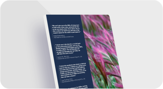 T H E 1 2 T “We can’t give up on the SDGs. It’s important “The SDGs provide a good common language H U N I to take stock, draw a line, and publicize that for people from different parts of the world T E so we can clearly state: this is where we are, for when they want to discuss sustainable D N A T this is where we need to go, and look at this development and the impact of their efforts.” I O N massive space for the world to participate in.” S G Grace Kwok May Han, L O Chairman and Executive Director of Allied Sustainability B Paddy Padmanathan, A Vice Chairman & CEO of ACWA Power and Environmental Consultants Group Limited L C O M P A C T - A “I believe that it’s the responsibility of every C C E “I think now is the time for us to fall back business to align their internal business N T U on the universal principles, such as the practices with the SDGs and see how many R of those practices they can adapt to and E C Global Compact 10 Principles and the SDGs, E to really reflect. The 10 Principles are follow consistently. Once you change your O S T U already two decades old, but today we processes, it will build momentum as your D still face the same issues.” employees and culture follow along.” Y Sandra Wu, Wen-Hsiu, Vineet Mittal, Chairperson and CEO of Kokusai Kogyo Co., Ltd. Chairman of Avaada Group “So far we’re yet to make the progress we “I think this pandemic has shown us that we need to on the SDGs, but you never know have to raise our ambition on a global scale. what surprises will arise. If there were It is clear that if we don’t quickly address stronger regulatory requirements, or issues around food, clothing, shelter, and increased funding from banking institutions, health, we will once more face crisis. If we then we will be able to achieve the SDGs work towards the 17 SDGs successfully, much faster.” then we have a chance.” Sudhir Hoshing, Isao Teshirogi, Ph.D., Chief Executive Officer of IRB Infrastructure Chief Executive Officer of Shionogi & Co., Ltd. Developers Ltd “There is still a gap between the ambition taken “We really believe in the SDGs. Looking and the impact created to achieve Agenda beyond 2030, those are still very useful 2030 due to the production of fossil fuels and targets for companies to set their own the use of non-renewable energy in many targets against. Even after we achieve them, countries. To bridge the gap, governments we need to make sure that progress will last.” and organizations must come together to Dr. David Kisa, build technology to track, reduce emissions, General Manager of Kenya Bixa Limited and boost renewable sources of energy.” CP Gurnani, Managing Director and Chief Executive Officer of Tech Mahindra “The sustainable development goals that the United Nations created enabled us to have some consistency in our sustainability plans. “I think there’s still a long way to go when Had those not existed, our sustainability it comes to the SDGs. But unless we have a plans would have been in disarray, with no set of goals and move towards it, we’ll never semblance of uniformity across the globe.” make progress.” Arun Misra, Hemanth Kumar, Chief Executive Officer of Hindustan Zinc Limited Partner at J.K.Sarawgi & Co., Chartered Accountants 28 29