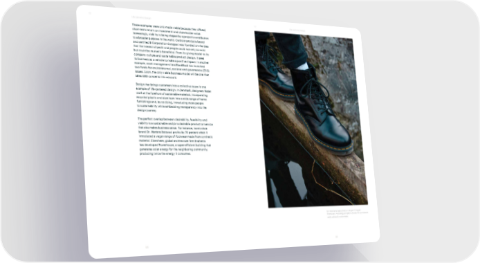 T7 Life-centered design T7 Life-centered design These examples were only made viable because they offered short-term return on investment and shareholder value. Increasingly, viability is being shaped by a project’s contribution to a broader purpose in the world. Outdoor products brand and certified B Corporation Cotopaxi was founded on the idea that the interest of profit and people could not only co-exist but could be mutually beneficial. From its giving model to its company culture and sustainable product design, it sees its business as a vehicle to make a positive impact. In another example, asset management firm BlackRock has launched two funds for environmental, societal and governance (ESG) issues. Soon, the only viable business model will be one that takes ESG concerns into account. Design that brings customers into a collective cause is one example of life-centered design. In Denmark, designers Mater work at the forefront of sustainable materials, incorporating recycled plastic and aluminum into a wide range of home furnishings and, by so doing, introducing more people to sustainability while embedding transparency into the design journey. The perfect overlap between desirability, feasibility and viability is a sustainable and/or a desirable product or service that also makes business sense. For instance, iconic shoe brand Dr. Martens boosted profits by 70 percent when it introduced a vegan range of footwear made from synthetic material. Elsewhere, global architecture firm Snøhetta has developed Powerhouse, a super-efficient building that generates solar energy for the neighboring community, producing twice the energy it consumes. Dr. Martens launched a range of vegan footwear, meeting people’s desire for products with ethical credentials. 95 96