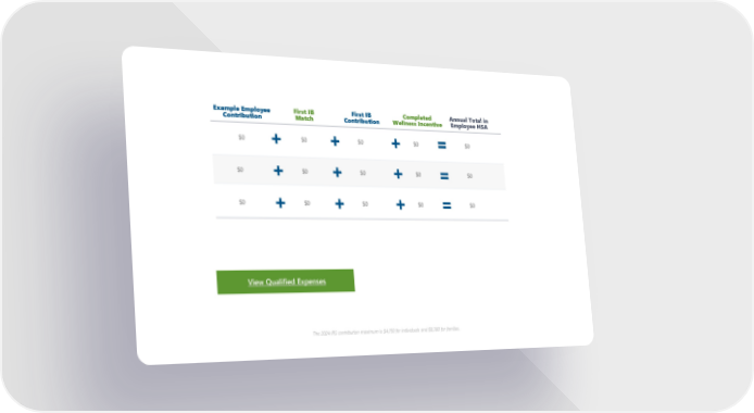Example Employee First IB First IB Completed Annual Total in Contribution Match Contribution Wellness Incentive Employee HSA $0 + $0 + $0 + $0 = $0 $0 + $0 + $0 + $0 = $0 $0 + $0 + $0 + $0 = $0 View Qualified Expenses The 2024 IRS contribution maximum is $4,150 for individuals and $8,300 for families.