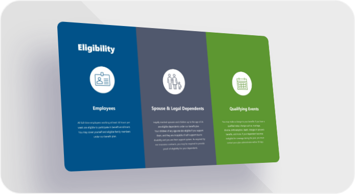 Eligibility Employees Spouse & Legal Dependents Qualifying Events All full-time employees working at least 30 hours per Legally married spouses and children up to the age of 26 You may make a change to your benefits if you have a week are eligible to participate in benefit enrollment. are eligible dependents under our benefit plan. qualified status change such as: marriage, You may cover yourself and eligible family members Your children of any age are also eligible if you support divorce, birth/adoption, death, changes in spouse’s under our benefit plan. them, and they are incapable of self-support due to benefits, and more. If your dependent becomes disability and you are their support system. As required by ineligible for coverage during the year, you must our insurance contracts, you may be required to provide contact your plan administrator within 30 days. proof of eligibility for your dependents.