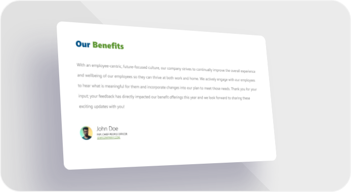 Our Benefits With an employee-centric, future-focused culture, our company strives to continually improve the overall experience and wellbeing of our employees so they can thrive at both work and home. We actively engage with our employees to hear what is meaningful for them and incorporate changes into our plan to meet those needs. Thank you for your input; your feedback has directly impacted our benefit offerings this year and we look forward to sharing these exciting updates with you! John Doe FVP, CHIEF PEOPLE OFFICER [email protected]