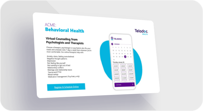 ACME: Behavioral Health Virtual Counseling from Psychologists and Therapists Choose a therapist, psychologist or psychiatrist who fits your needs and schedule visits 7 days a week from wherever you're most comfortable. Our online therapists help with: Anxiety, stress, feeling overwhelmed Negative thought patterns Depression Not feeling like yourself Not wanting to get out of bed Relationship conflicts Marriage and relationship issues Trauma and PTSD Mood swings Medication management (Psychiatry only) Register & Schedule Online