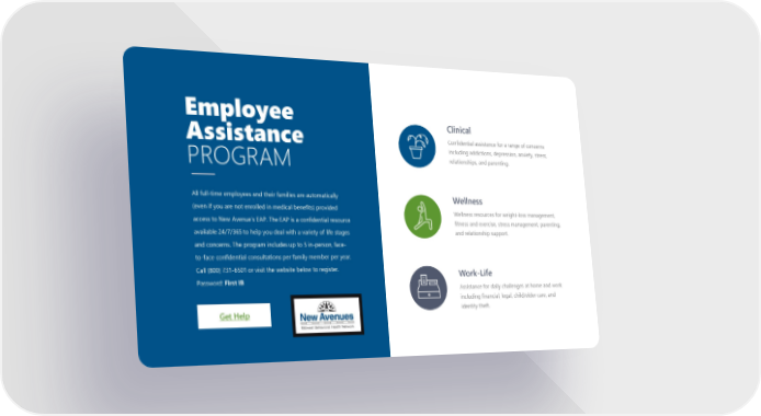 Employee Clinical Assistance Confidential assistance for a range of concerns including addictions, depression, anxiety, stress, PROGRAM relationships, and parenting. All full-time employees and their families are automatically Wellness (even if you are not enrolled in medical benefits) provided Wellness resources for weight-loss management, access to New Avenue’s EAP. The EAP is a confidential resource fitness and exercise, stress management, parenting, available 24/7/365 to help you deal with a variety of life stages and relationship support. and concerns. The program includes up to 5 in-person, face- to-face confidential consultations per family member per year. Call (800) 731-6501 or visit the website below to register. Work-Life Password: First IB Assistance for daily challenges at home and work including financial, legal, child/elder care, and Get Help identity theft.