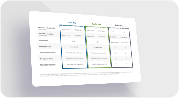 Base Plan Buy-Up Plan Surest Plan IN-NETWORK OUT-OF-NETWORK IN-NETWORK OUT-OF-NETWORK IN-NETWORK OUT-OF-NETWORK Embedded Deductible $0.00 / $0.00 $0.00/ $0.00 $0.00/ $0.00 $0.00/ $0.00 $0 $0 (Single/Family) Out-of-Pocket Max $0.00 / $0.00 $0.00/ $0.00 $0.00/ $0.00 $0.00/ $0.00 $0.00/ $0.00 $0.00/ $0.00 (Single/Family) Coinsurance 20% 20% No coinsurance No coinsurance Preventive Care Covered 100% Covered 100% $0 $0 Physician Office Visit Deductible, then coinsurance Deductible, then coinsurance $0 $0 Emergency Room Deductible, then coinsurance Deductible, then coinsurance $0 $0 Urgent Care Centers Deductible, then coinsurance Deductible, then coinsurance $0 $0 Deductible year runs on the calendar year. Coinsurance kicks in once the calendar year deductible is met. Preventive care services include but are not limited to routine wellness exams, pelvic exams, pap testing, PSA tests, immunizations, annual diabetic eye exam, routine vision and hearing exams. Covers preventive care services rendered in a physician's office and outpatient service centers.