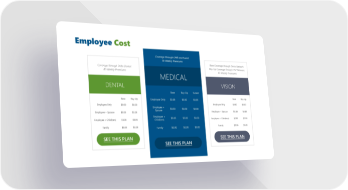 Employee Cost Coverage through UMR and Surest Bi-Weekly Premiums Base Coverage through Davis Network Coverage through Delta Dental Buy-Up Coverage through VSP Network Bi-Weekly Premiums MEDICAL Bi-Weekly Premiums DENTAL VISION Base Buy-Up Surest Base Buy-Up Employee Only $0.00 $0.00 $0.00 Base Buy-Up Employee Only $0.00 $0.00 Employee + Employee Only $0.00 $0.00 Spouse $0.00 $0.00 $0.00 Employee + Spouse $0.00 $0.00 Employee + Spouse $0.00 $0.00 Employee + Employee + Child(ren) $0.00 $0.00 Child(ren) $0.00 $0.00 $0.00 Employee + Child(ren) $0.00 $0.00 Family $0.00 $0.00 Family $0.00 $0.00 $0.00 Family $0.00 $0.00 SEE THIS PLAN SEE THIS PLAN SEE THIS PLAN
