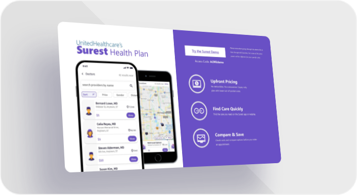 Please note when going through the demo this is how the app will function, but some of the price UnitedHealthcare’s Try the Surest Demo Surest Health Plan points will be different for your specific plan. Access Code: ACMEdemo Upfront Pricing No deductibles. No coinsurance. Copay-only plan with lower out-of-pocket costs. Find Care Quickly Find the care you need on the Surest app or website. Compare & Save Check costs and compare options before you make an appointment.