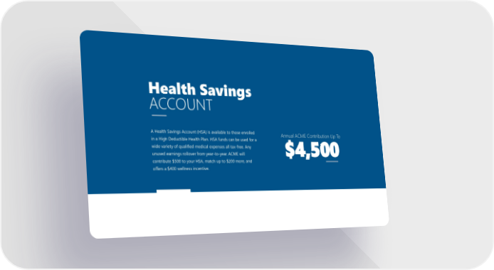 Health Savings ACCOUNT A Health Savings Account (HSA) is available to those enrolled Annual ACME Contribution Up To in a High Deductible Health Plan. HSA funds can be used for a wide variety of qualified medical expenses all tax-free. Any unused earnings rollover from year-to-year. ACME will $4,500 contribute $500 to your HSA, match up to $200 more, and offers a $400 wellness incentive.