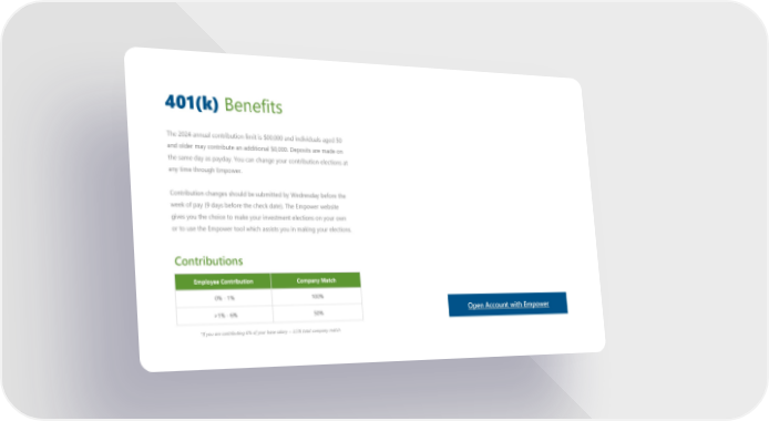 401(k) Benefits The 2024 annual contribution limit is $00,000 and individuals aged 50 and older may contribute an additional $0,000. Deposits are made on the same day as payday. You can change your contribution elections at any time through Empower. Contribution changes should be submitted by Wednesday before the week of pay (9 days before the check date). The Empower website gives you the choice to make your investment elections on your own or to use the Empower tool which assists you in making your elections. Contributions Employee Contribution Company Match 0% - 1% 100% >1% - 6% 50% Open Account with Empower *If you are contributing 6% of your base salary = 3.5% total company match