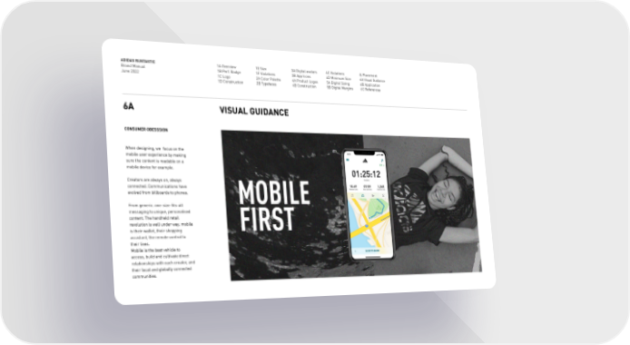 ADIDAS RUNTASTIC Brand Manual June 2022 1A Overview 1B Perf. Badge 1C Logo 1D Construction 1E Size 1F Violations 2A Color Palette 2B Typefaces 3A Digital avatars 3B App Icons 4A Product Logos 4B Construction 4C Violations 4D Minimum Size 5A Digital Sizing 5B Digital Margins & Placement 6A Visual Guidance 6B Application 6C References 6A VISUAL GUIDANCE CONSUMER OBESSSION When designing, we focus on the mobile user experience by making sure the content is readable on a mobile device for example. Creators are always on, always connected. Communications have evolved from billboards to phones. From generic. one-size-fits-all messaging to unique, personalised content. The handheld retail revolution is well under way; mobile is their wallet, their shopping assistant, the remote control to their lives. Mobile is the best vehicle to access, build and cultivate direct relationships with each creator, and their local and globally connected communities. MOBILE FIRST