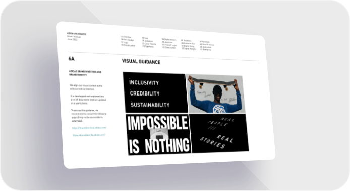 ADIDAS RUNTASTIC Brand Manual June 2022 1A Overview 1B Perf. Badge 1C Logo 1D Construction 1E Size 1F Violations 2A Color Palette 2B Typefaces 3A Digital avatars 3B App Icons 4A Product Logos 4B Construction 4C Violations 4D Minimum Size 5A Digital Sizing 5B Digital Margins & Placement 6A Visual Guidance 6B Application 6C References 6A VISUAL GUIDANCE ADIDAS BRAND DIRECTION AND BRAND IDENTITY We align our visual content to the adidas creative direction. It is developped and explained into a set of documents that are updated on a yearly basis. To access this guidance, we recommend to consult the following pages (may not be accessible to externals): https://branddirection.adidas.com/ https://brandidentity.adidas.com/