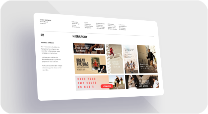 ADIDAS RUNTASTIC Brand Manual June 2022 1A Overview 1B Perf. Badge 1C Logo 1D Construction 1E Size 1F Violations 2A Color Palette 2B Typefaces 3A Digital avatars 3B App Icons 4A Product Logos 4B Construction 4C Violations 4D Minimum Size 5A Digital Sizing 5B Digital Margins & Placement 6A Visual Guidance 6B Application 6C References 2B HIERARCHY VARIABLE APPROACH For more creative flexibility, the typography hierarchy can vary according to the seasonal syles, campaigns and activations. It is important to follow the dedicated typography guidelines prepared for each use case. Fonts can be combined in mutliple different ways, like shown on the examples.