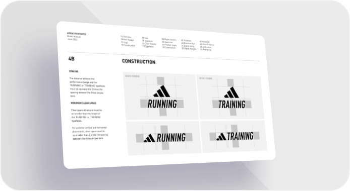 ADIDAS RUNTASTIC Brand Manual June 2022 1A Overview 1B Perf. Badge 1C Logo 1D Construction 1E Size 1F Violations 2A Color Palette 2B Typefaces 3A Digital avatars 3B App Icons 4A Product Logos 4B Construction 4C Violations 4D Minimum Size 5A Digital Sizing 5B Digital Margins & Placement 6A Visual Guidance 6B Application 6C References 4B CONSTRUCTION SPACING The distance between the performance badge and the RUNNING or TRAINING typefaces must be equivalent to 2 times the spacing between the three stripes bars. MINUMUM CLEAR SPACE Clear space all around must be no smaller than the height of the RUNNING or TRAINING typefaces. For extreme vertical and horizontal placements, clear space must be no smaller than 2 times the spacing between the three stripes bars. ADIDAS RUNNING ADIDAS TRAINING