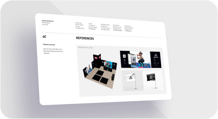 ADIDAS RUNTASTIC Brand Manual June 2022 1A Overview 1B Perf. Badge 1C Logo 1D Construction 1E Size 1F Violations 2A Color Palette 2B Typefaces 3A Digital avatars 3B App Icons 4A Product Logos 4B Construction 4C Violations 4D Minimum Size 5A Digital Sizing 5B Digital Margins & Placement 6A Visual Guidance 6B Application 6C References 6C REFERENCES Channels overview Here are some examples of our Brand look & feel accross all our channels. BRAND MARKETING / EVENTS