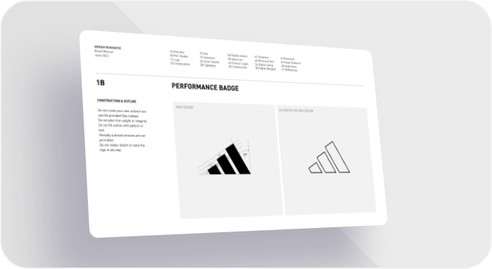 ADIDAS RUNTASTIC Brand Manual June 2022 1A Overview 1B Perf. Badge 1C Logo 1D Construction 1E Size 1F Violations 2A Color Palette 2B Typefaces 3A Digital avatars 3B App Icons 4A Product Logos 4B Construction 4C Violations 4D Minimum Size 5A Digital Sizing 5B Digital Margins & Placement 6A Visual Guidance 6B Application 6C References 1B PERFORMANCE BADGE CONSTRUCTION & OUTLINE Do not create your own artwork but use the provided files instead. Do not alter line-weight or integrity. Do not fill outline with pattern or text. Partially outlined versions are not permitted. Do not rotate, distort or warp the logo in any way. MAIN VERSION ALTERNATIVE OUTLINED VERSION