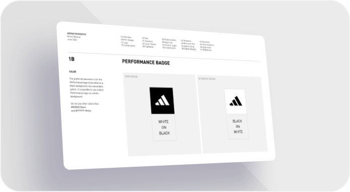 ADIDAS RUNTASTIC Brand Manual June 2022 1A Overview 1B Perf. Badge 1C Logo 1D Construction 1E Size 1F Violations 2A Color Palette 2B Typefaces 3A Digital avatars 3B App Icons 4A Product Logos 4B Construction 4C Violations 4D Minimum Size 5A Digital Sizing 5B Digital Margins & Placement 6A Visual Guidance 6B Application 6C References 1B PERFORMANCE BADGE COLOR The preferred execution is for the Performance logo to be white on a black background. As a secondary option, it is possible to use a black Performance logo on a white background. Do not use other colors than #000000 Black and #FFFFFF White. MAIN VERSION ALTERNATIVE VERSION BLACK ON WHITE WHITE ON BLACK