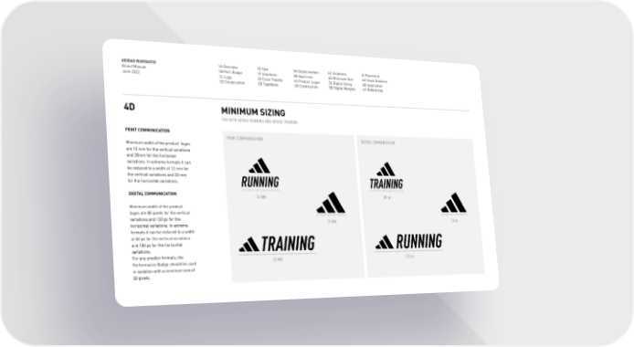 ADIDAS RUNTASTIC Brand Manual June 2022 1A Overview 1B Perf. Badge 1C Logo 1D Construction 1E Size 1F Violations 2A Color Palette 2B Typefaces 3A Digital avatars 3B App Icons 4A Product Logos 4B Construction 4C Violations 4D Minimum Size 5A Digital Sizing 5B Digital Margins & Placement 6A Visual Guidance 6B Application 6C References 4D MINIMUM SIZING PRINT COMMUNICATION Minimum width of the product logos are 15 mm for the vertical variations and 35mm for the horizonal variations. In extreme formats it can be reduced to a width of 12 mm for the vertical variations and 32 mm for the horizontal variations. DIGITAL COMMUNICATION Minimum width of the product logos are 80 pixels for the vertical variations and 120 px for the horizontal variations. In extreme formats it can be reduced to a width of 60 px for the vertical variations and 100 px for the horizontal variations. For any smaller formats, the Performance Badge should be used in isolation with a minimum size of 30 pixels. DIGITAL COMMUNICATION PRINT COMMUNICATION 80 px 15 MM FOR BOTH ADIDAS RUNNING AND ADIDAS TRAINING 35 MM 120 px 30 px 12 MM