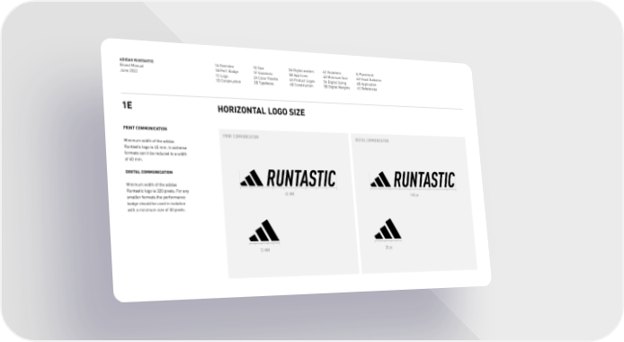 ADIDAS RUNTASTIC Brand Manual June 2022 1A Overview 1B Perf. Badge 1C Logo 1D Construction 1E Size 1F Violations 2A Color Palette 2B Typefaces 3A Digital avatars 3B App Icons 4A Product Logos 4B Construction 4C Violations 4D Minimum Size 5A Digital Sizing 5B Digital Margins & Placement 6A Visual Guidance 6B Application 6C References 1E HORIZONTAL LOGO SIZE PRINT COMMUNICATION Minimum width of the adidas Runtastic logo is 45 mm. In extreme formats can it be reduced to a width of 40 mm. DIGITAL COMMUNICATION Minimum width of the adidas Runtastic logo is 320 pixels. For any smaller formats the performance badge should be used in isolation with a minimum size of 30 pixels. DIGITAL COMMUNICATION 45 MM 160 px 30 px 12 MM PRINT COMMUNICATION