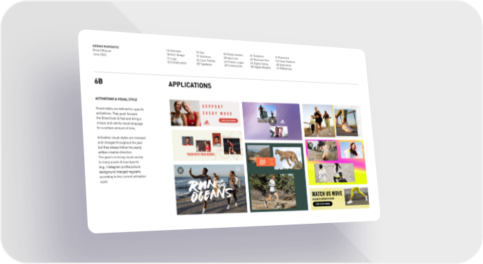 ADIDAS RUNTASTIC Brand Manual June 2022 1A Overview 1B Perf. Badge 1C Logo 1D Construction 1E Size 1F Violations 2A Color Palette 2B Typefaces 3A Digital avatars 3B App Icons 4A Product Logos 4B Construction 4C Violations 4D Minimum Size 5A Digital Sizing 5B Digital Margins & Placement 6A Visual Guidance 6B Application 6C References 6B APPLICATIONS ACTIVATIONS & VISUAL STYLE Visual styles are defined for specific activations. They push forward the Brand look & feel and bring a unique and catchy visual language for a certain amount of time. Activation visual styles are renewed and changed throughout the year but they always follow the yearly adidas creative direction. The goal is to bring visual variety to many assets & touchpoints (e.g.: Instagram profile picture background changed regularly according to the current activation style).