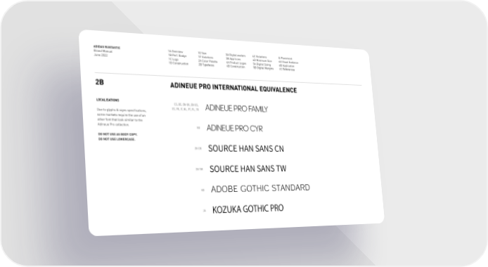 ADIDAS RUNTASTIC Brand Manual June 2022 1A Overview 1B Perf. Badge 1C Logo 1D Construction 1E Size 1F Violations 2A Color Palette 2B Typefaces 3A Digital avatars 3B App Icons 4A Product Logos 4B Construction 4C Violations 4D Minimum Size 5A Digital Sizing 5B Digital Margins & Placement 6A Visual Guidance 6B Application 6C References ADINEUE PRO FAMIL Y ADINEUE PRO CYR SOURCE HAN SANS CN SOURCE HAN SANS TW ADOBE GOTHIC STANDARD KOZUKA GOTHIC PRO 2B ADINEUE PRO INTERNATIONAL EQUIVALENCE LOCALISATIONS Due to glyphs & signs specifications, some markets require the use of an other font that look similar to the Adineue Pro collection. DO NOT USE AS BODY COPY. DO NOT USE LOWERCASE. CS, DE, EN-UK, EN-US, ES, FR, IT, NL, PT, PL, TR RU ZH-CN ZH-TW KO JA