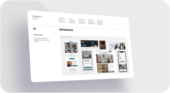 ADIDAS RUNTASTIC Brand Manual June 2022 1A Overview 1B Perf. Badge 1C Logo 1D Construction 1E Size 1F Violations 2A Color Palette 2B Typefaces 3A Digital avatars 3B App Icons 4A Product Logos 4B Construction 4C Violations 4D Minimum Size 5A Digital Sizing 5B Digital Margins & Placement 6A Visual Guidance 6B Application 6C References 6C REFERENCES Channels overview Here are some examples of our Brand look & feel accross all our channels. DIGITAL COMMUNICATION
