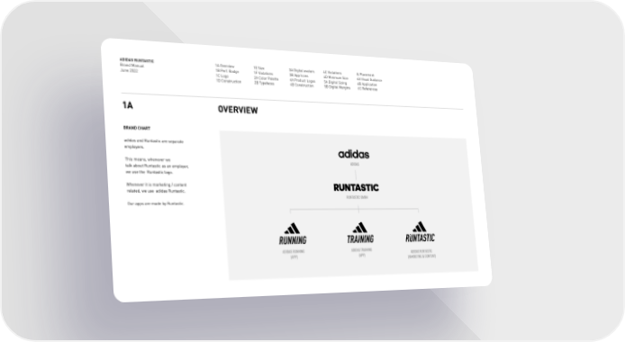 ADIDAS RUNTASTIC Brand Manual June 2022 1A Overview 1B Perf. Badge 1C Logo 1D Construction 1E Size 1F Violations 2A Color Palette 2B Typefaces 3A Digital avatars 3B App Icons 4A Product Logos 4B Construction 4C Violations 4D Minimum Size 5A Digital Sizing 5B Digital Margins & Placement 6A Visual Guidance 6B Application 6C References BRAND CHART adidas and Runtastic are separate employers. This means, whenever we talk about Runtastic as an employer, we use the Runtastic logo. Whenever it is marketing / content related, we use adidas Runtastic. Our apps are made by Runtastic. 1A OVERVIEW