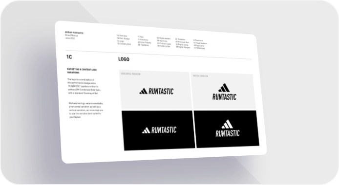 ADIDAS RUNTASTIC Brand Manual June 2022 1A Overview 1B Perf. Badge 1C Logo 1D Construction 1E Size 1F Violations 2A Color Palette 2B Typefaces 3A Digital avatars 3B App Icons 4A Product Logos 4B Construction 4C Violations 4D Minimum Size 5A Digital Sizing 5B Digital Margins & Placement 6A Visual Guidance 6B Application 6C References MARKETING & CONTENT LOGO VARIATIONS The logo is a combination of the performance badge and a RUNTASTIC typeface written in adihausDIN Condensed Bold Italic, with a standard Tracking of 0pt. We have two logo versions available, a horizontal variation as well as a vertical variation, we encourage you to use the variation best suited to your layout. 1C LOGO HORIZONTAL VARIATION VERTICAL VARIATION
