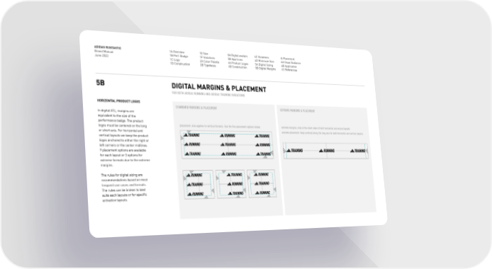 ADIDAS RUNTASTIC Brand Manual June 2022 1A Overview 1B Perf. Badge 1C Logo 1D Construction 1E Size 1F Violations 2A Color Palette 2B Typefaces 3A Digital avatars 3B App Icons 4A Product Logos 4B Construction 4C Violations 4D Minimum Size 5A Digital Sizing 5B Digital Margins & Placement 6A Visual Guidance 6B Application 6C References 5B DIGITAL MARGINS & PLACEMENT HORIZONTAL PRODUCT LOGOS In digital ATL, margins are equivalent to the size of the performance badge. The product logos must be centered on the long or short axis. For horizontal and vertical layouts we keep the product logos anchored to either the right or left corners or the center midlines. 9 placement options are available for each layout or 3 options for extreme formats due to the extreme margins. The rules for digital sizing are recommendations based on most frequent use cases and formats. The rules can be broken to best suits each layouts or for specific activation layouts. STANDARD MARGINS & PLACEMENT EXTREME MARGINS & PLACEMENT placement: also applies to vertical formats. Use the five placement options below. extreme margins: only at the short sides of both horizontal and verical layouts. extreme placement: keep centered along the long axis for both horizontal and vertical layouts. FOR BOTH ADIDAS RUNNING AND ADIDAS TRAINING VARIATIONS