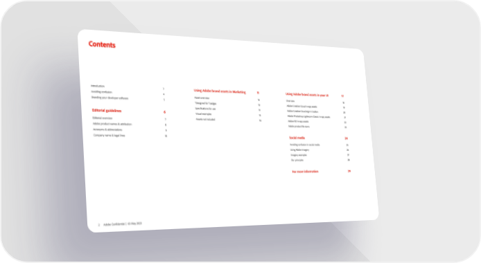 Contents Introduction 3 Using Adobe brand assets in Marketing 11 Using Adobe brand assets in your UI 17 Avoiding confusion 4 Asset overview 12 Overview 18 Branding your developer software 5 "Designed for" badges 13 Adobe Creative Cloud in-app assets 19 Specifications for use 14 Adobe Creative Cloud sign-in button 20 Editorial guidelines 6 Visual examples 15 Adobe Photoshop Lightroom Classic in-app assets 21 Editorial overview 7 Assets not included 16 Adobe XD in-app assets 22 Adobe product names & attribution 8 Adobe product file icons 23 Acronyms & abbreviations 9 Company name & legal lines 10 Social media 24 Avoiding confusion in social media 25 Using Adobe imagery 26 Imagery examples 27 Our principles 28 For more information 29 2 Adobe Confidential | 03 May 2023