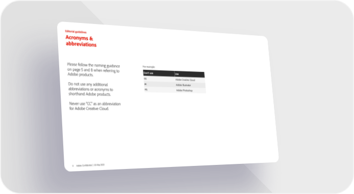 Editorial guidelines Acronyms & abbreviations Please follow the naming guidance For example: on page 5 and 8 when referring to Don't use Use Adobe products. CC Adobe Creative Cloud Do not use any additional AI Adobe Illustrator abbreviations or acronyms to PS Adobe Photoshop shorthand Adobe products. Never use “CC” as an abbreviation for Adobe Creative Cloud. 9 Adobe Confidential | 03 May 2023