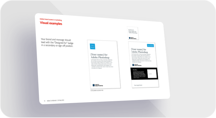 Adobe brand assets in marketing Visual examples Social post: [Your name] for Adobe Photoshop Your brand and message should lead with the "Designed for" badge Your Brand in a secondary or sign-off position. Your Brand [Your name] for Adobe Photoshop Lorem ipsum dolor sit amet, consectetuer adipiscing [Your name] for elit, sed diam nonummy nibh euismod tincidunt ut laoreet dolore magna aliquam erat volutpat. Ut wisi Adobe Photoshop enim ad minim veniam, quis nostrud exerci tation Lorem ipsum dolor sit amet, consectetuer adipiscing ullamcorper suscipit lobortis nisl ut aliquip ex ea elit, sed diam nonummy nibh euismod tincidunt ut commodo consequat. Duis autem vel eum iriure dolor laoreet dolore magna aliquam erat volutpat. Ut wisi in hendrerit in vulputate enim ad minim veniam, quis nostrud exerci tation ullamcorper suscipit lobortis nisl ut aliquip ex ea commodo consequat. Duis autem vel eum iriure dolor in hendrerit in vulputate Headline Lorem ipsum dolor sit amet, consectetuer adipiscing elit, sed diam nonummy nibh euismod tincidunt ut laoreet dolore magna Screenshot aliquam erat volutpat. Ut wisi enim ad minim veniam, quis nostrud exerci tation ullamcorper suscipit lobortis nisl ut aliquip ex ea commodo consequat. Duis autem vel eum iriure dolor in hendrerit in vulputate Your legal footer For illustrative purposes only. 15 Adobe Confidential | 03 May 2023