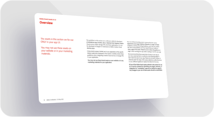 Adobe brand assets in UI Overview The assets in this section are for use The guidelines in this section are a reference solely for developers Your use of these branding assets is governed by the License ONLY in your app UI. of standalone apps (mobile, web, or desktop) that integrate Creative Agreements and Usage Guidelines referred to on page 3 of these Cloud service and/or storage APIs into those applications. It is not Guidelines and these Branding Guidelines, and if any use violates for developers of plugins or extensions to Adobe Creative Cloud the Terms and Guidelines, we may request that you modify or You may not use these assets on desktop apps. cease usage of the assets. Please be sure to follow the guidance on your website or in your marketing It documents proper, limited use in your application of the specific page 5 when naming your app and/or creating an icon for your app. materials. Adobe trademarks displayed in this section. Carefully review these We recommend that these assets look at home in your app, so guidelines when integrating Creative Cloud service or storage APIs you may customize them as outlined on the following pages to in your application. best match the style of your app. Please do not stretch, redraw, or You may not use these brand assets on your website or in any otherwise alter the shape of the assets, letterforms within the icons, marketing materials for your application. or use a different typeface to replace the letters for the icons. All use of the Adobe brand assets outlined in this section for use in UI must be reviewed by submitting your plugin, extension, or integration for "marketplace" approval as outlined on page 29. Any changes to your use of these assets should be resubmitted. 18 Adobe Confidential | 03 May 2023