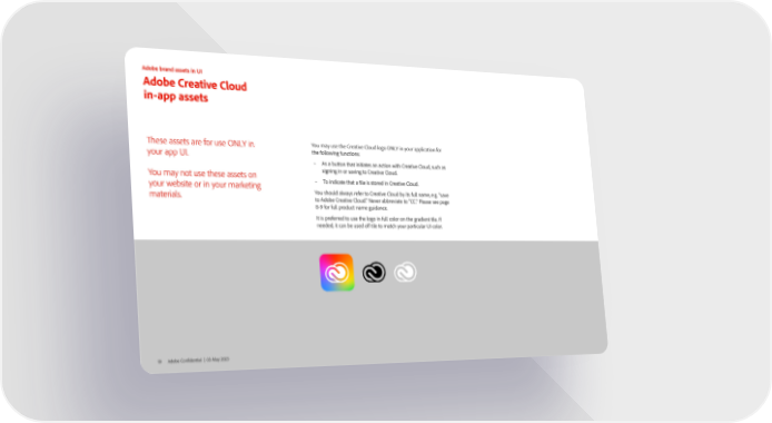 Adobe Creative Cloud in-app assets These assets are for use ONLY in your app UI. You may not use these assets on your website or in your marketing materials. You may use the Creative Cloud logo ONLY in your application for the following functions: • As a button that initiates an action with Creative Cloud, such as signing in or saving to Creative Cloud. • To indicate that a file is stored in Creative Cloud. You should always refer to Creative Cloud by its full name, e.g. “save to Adobe Creative Cloud." Never abbreviate to "CC." Please see page 8-9 for full product name guidance. It is preferred to use the logo in full color on the gradient tile. If needed, it can be used off tile to match your particular UI color. 19 Adobe Confidential | 03 May 2023 Adobe brand assets in UI