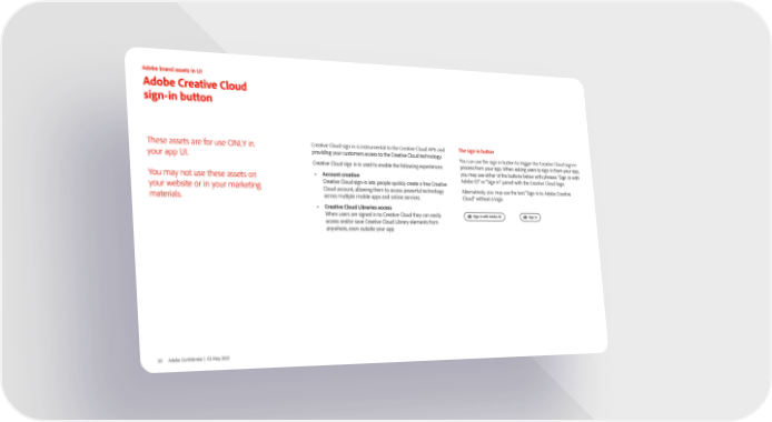 Adobe brand assets in UI Adobe Creative Cloud sign-in button These assets are for use ONLY in Creative Cloud sign in is instrumental to the Creative Cloud APIs and The sign-in button your app UI. providing your customers access to the Creative Cloud technology. You can use the sign in button to trigger the Creative Cloud sign in Creative Cloud sign in is used to enable the following experiences: process from your app. When asking users to sign in from your app, You may not use these assets on • Account creation you may use either of the buttons below with phrases “Sign in with Creative Cloud sign-in lets people quickly create a free Creative Adobe ID” or “Sign in” paired with the Creative Cloud logo. your website or in your marketing Cloud account, allowing them to access powerful technology Alternatively, you may use the text "Sign in to Adobe Creative materials. across multiple mobile apps and online services. Cloud" without a logo. • Creative Cloud Libraries access When users are signed in to Creative Cloud they can easily access and/or save Creative Cloud Library elements from anywhere, even outside your app. 20 Adobe Confidential | 03 May 2023